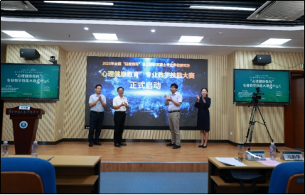 最后,查道林副书记、雷万鹏教授、周宗奎教授和马红宇教授在热烈的掌声中共同开启了2023年全国“田家炳杯”全日制教育硕士专业学位研究生“心理健康教育”专业教学技能大赛启动标识。